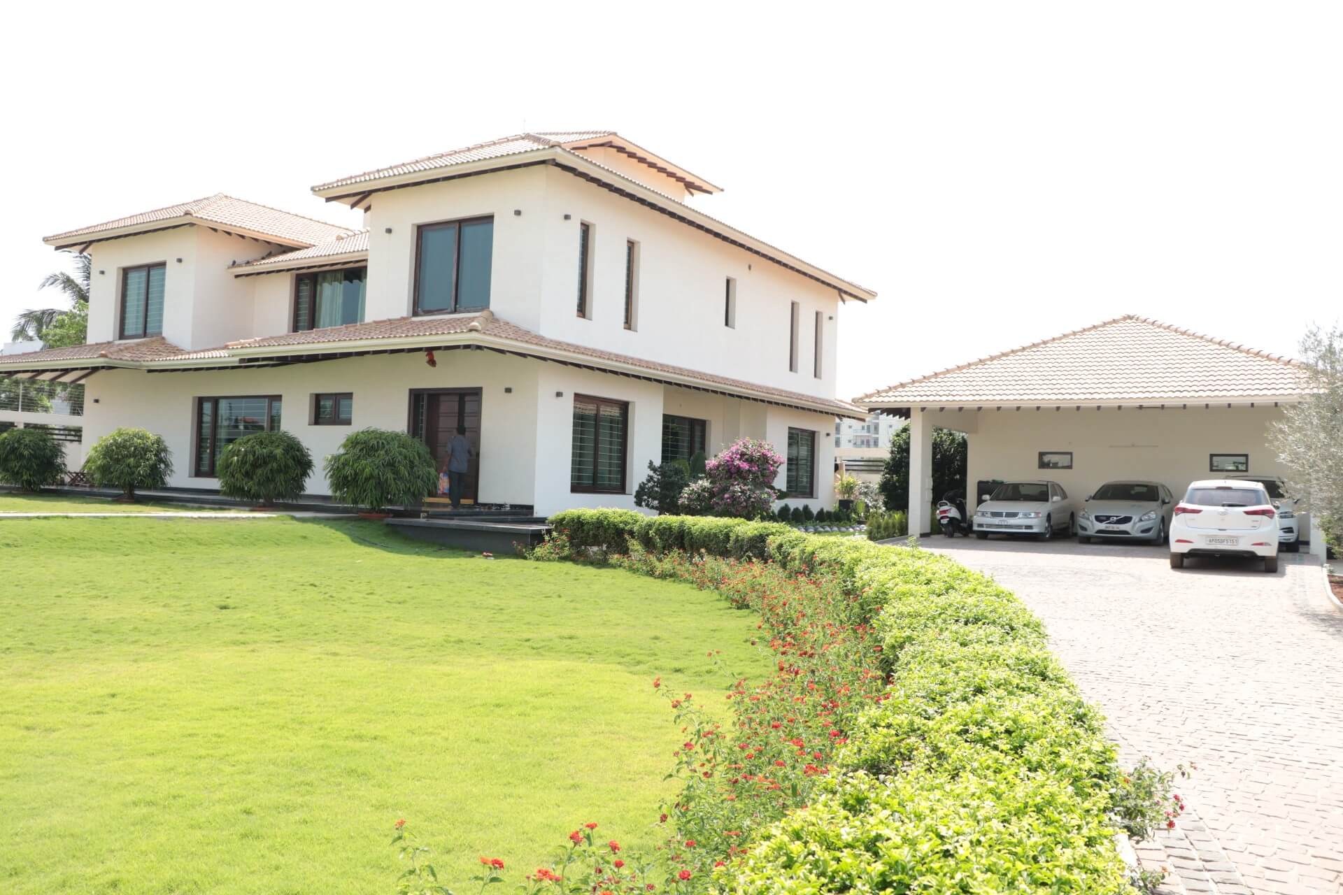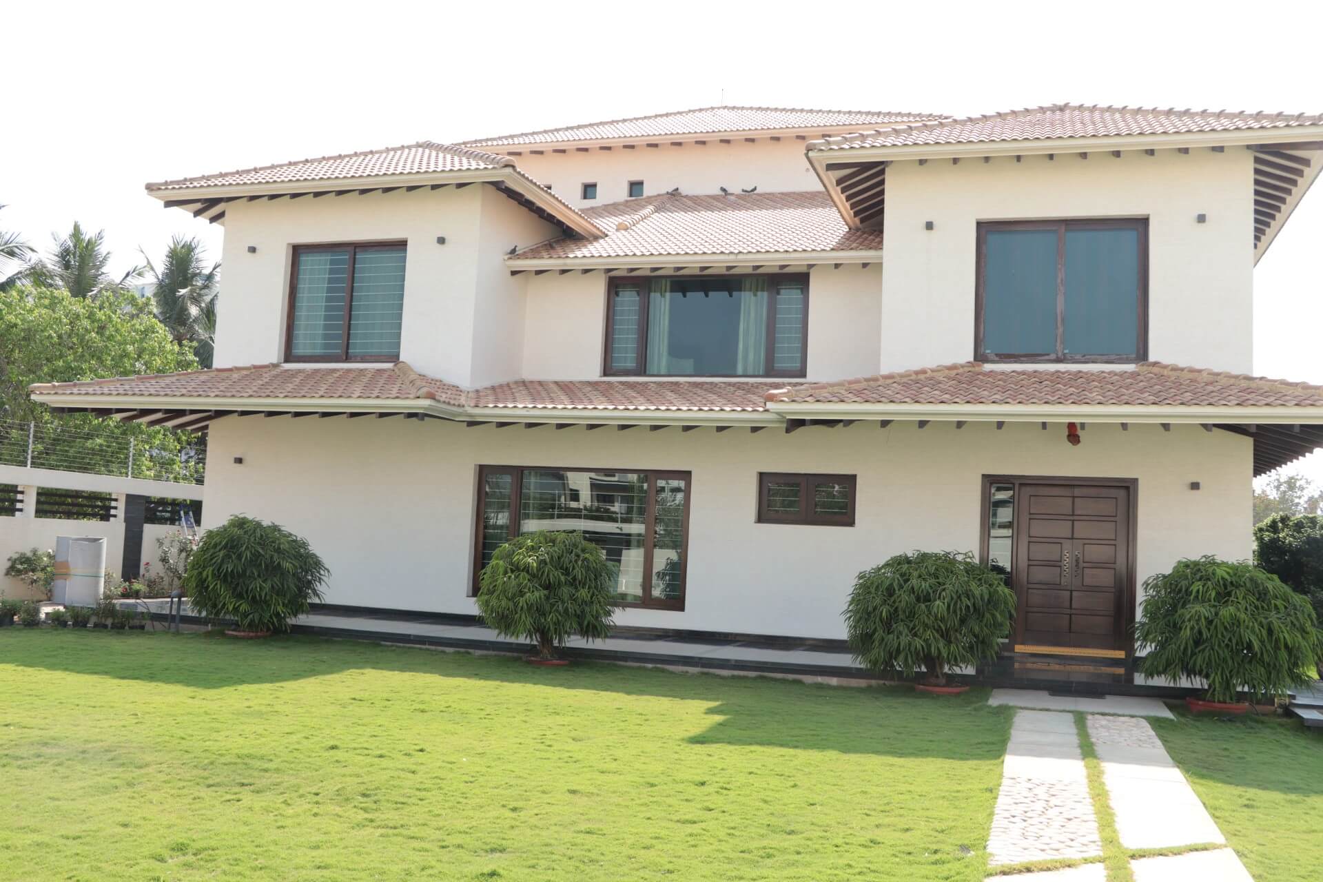 Roof is the element that allows a delineated space to transform into one that feels protected. Pitched roof is one such roof and also stands for its traditional aesthetics. Here, landscaping also adds an overall appeal to the house and ensures a pleasant and soothing ambience of this building.