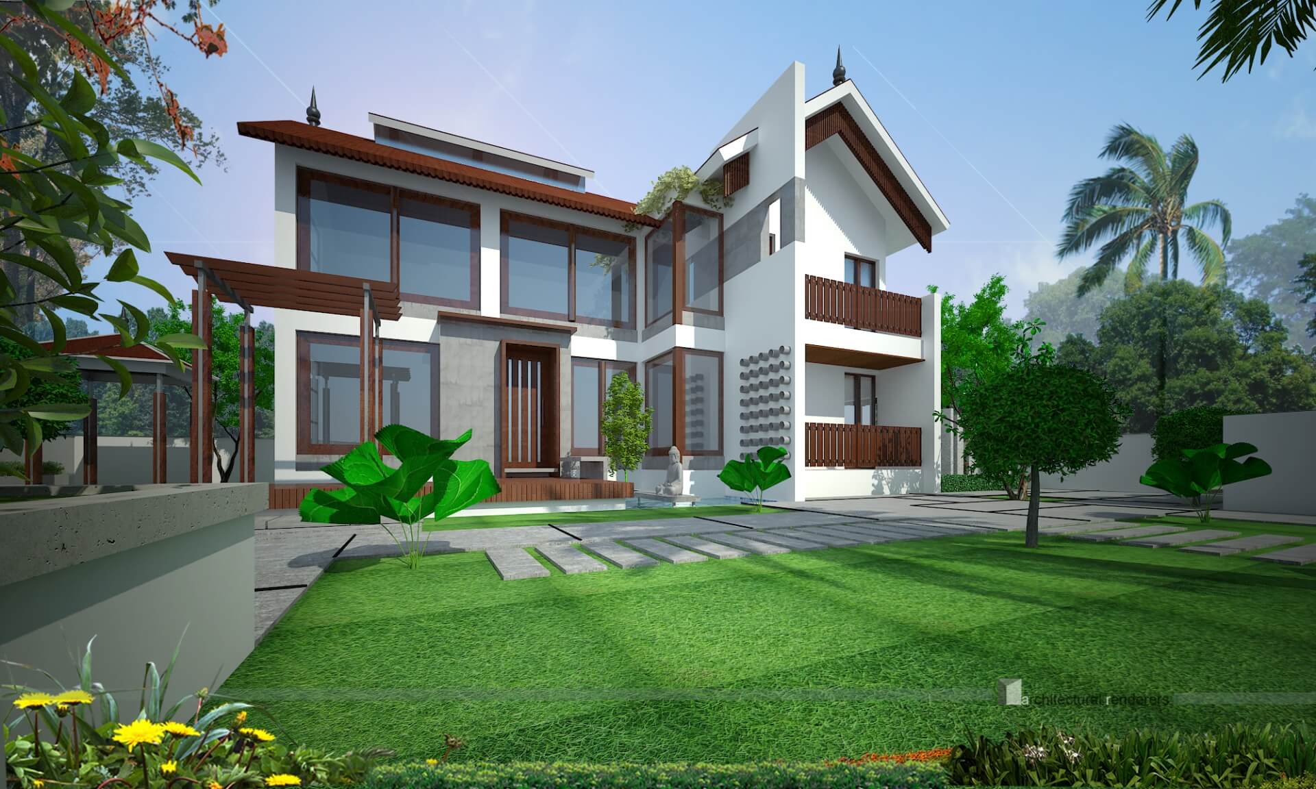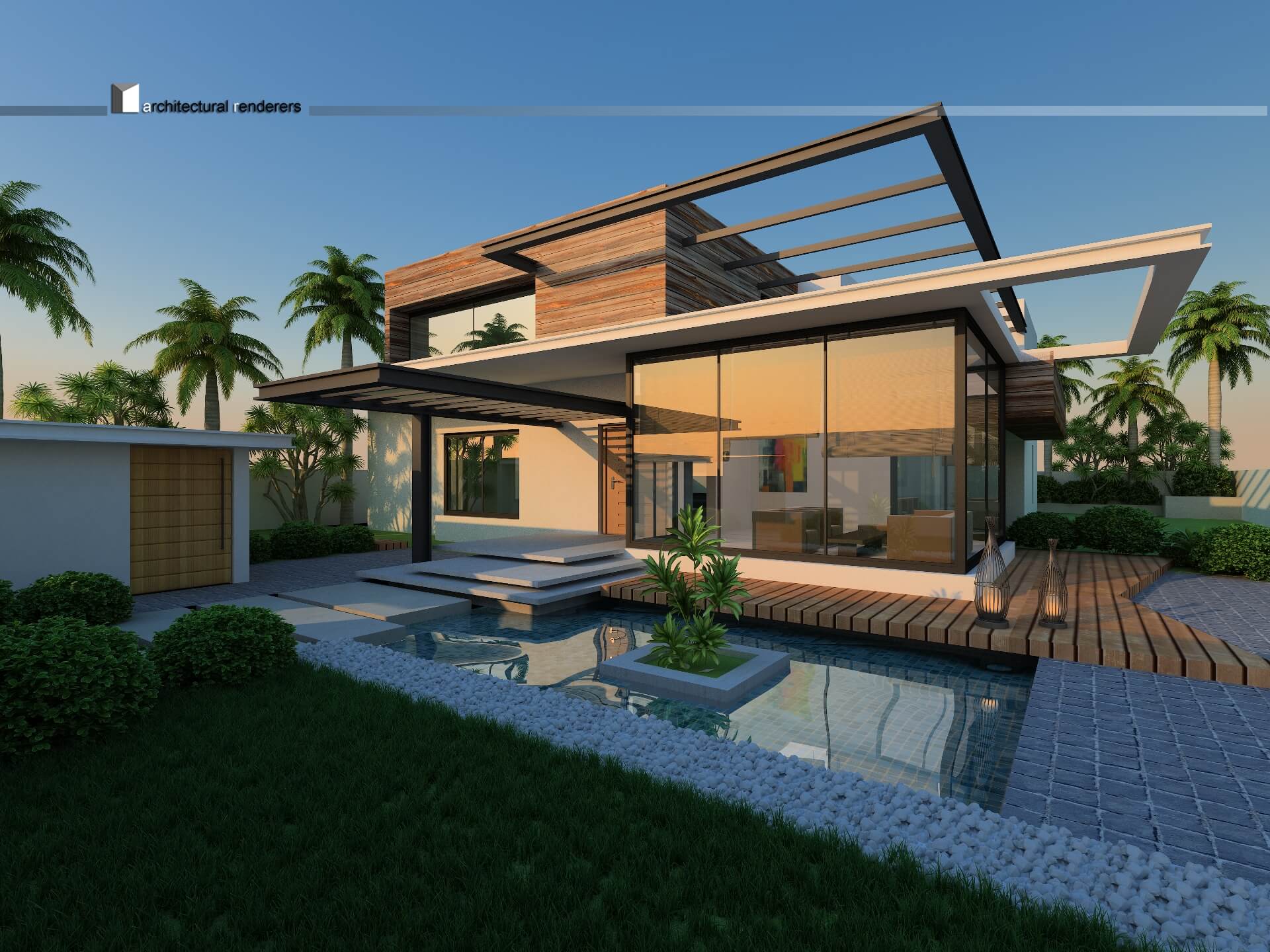 A pergola is designed along the pool in the garden as a shady spot to relax and enjoy.