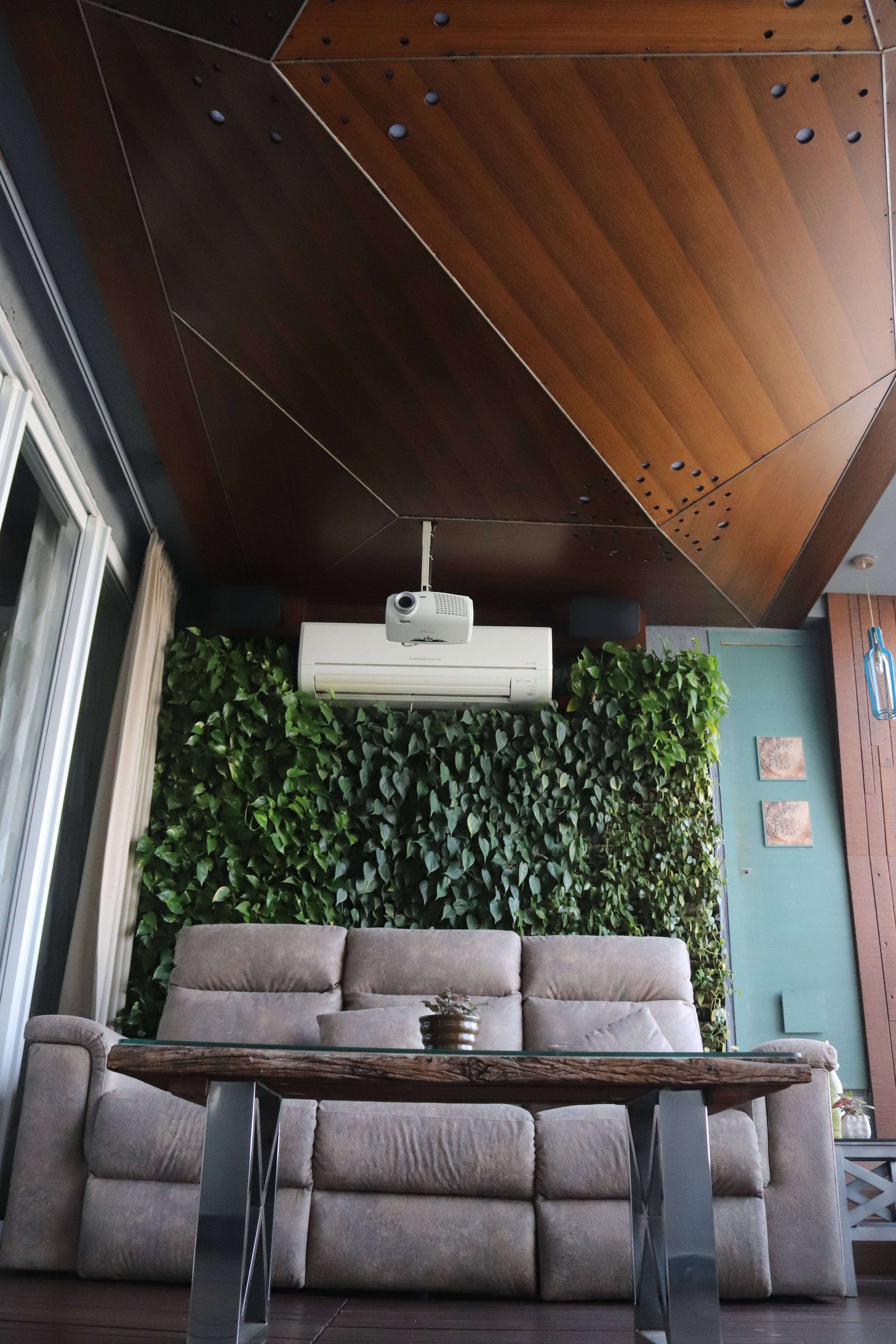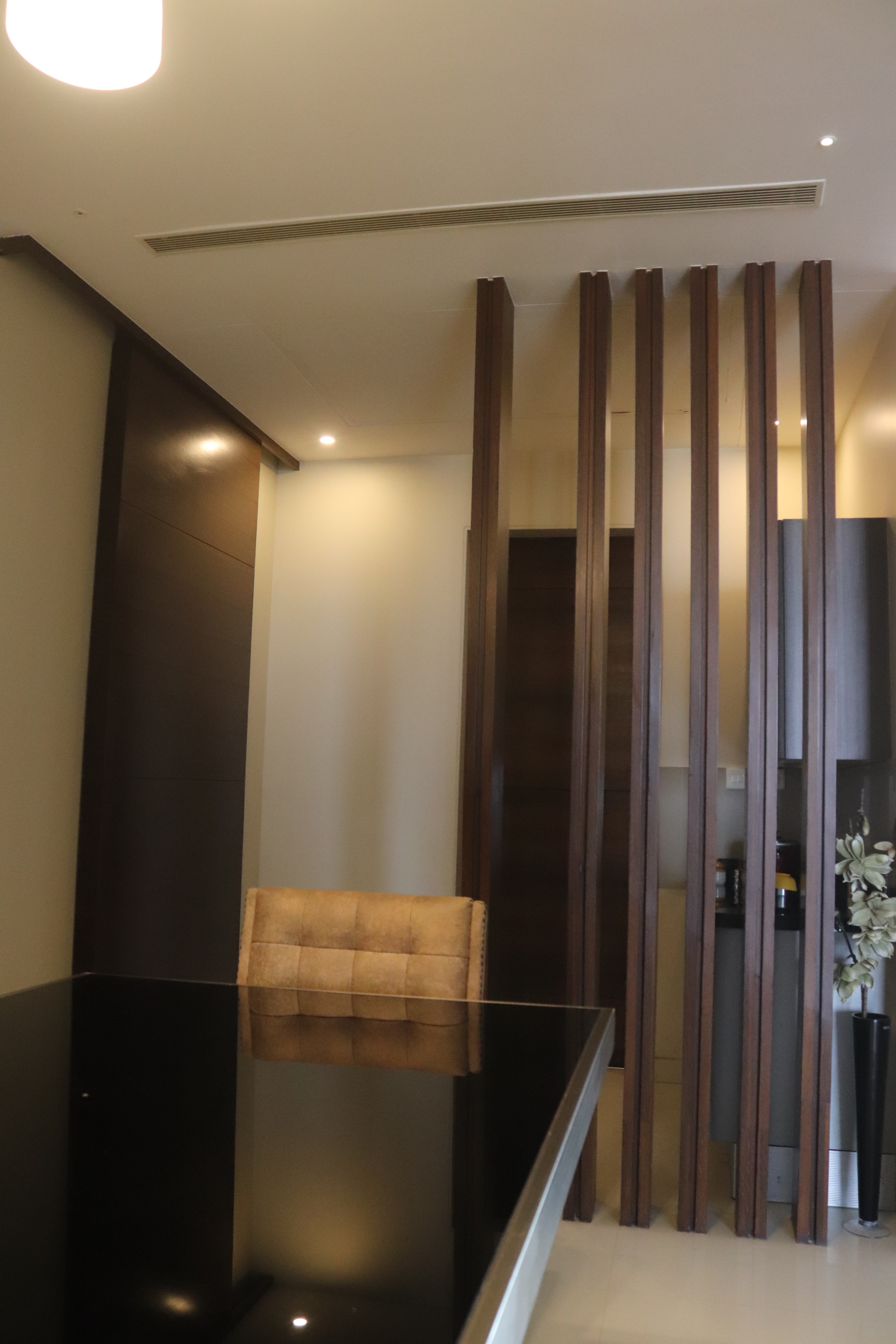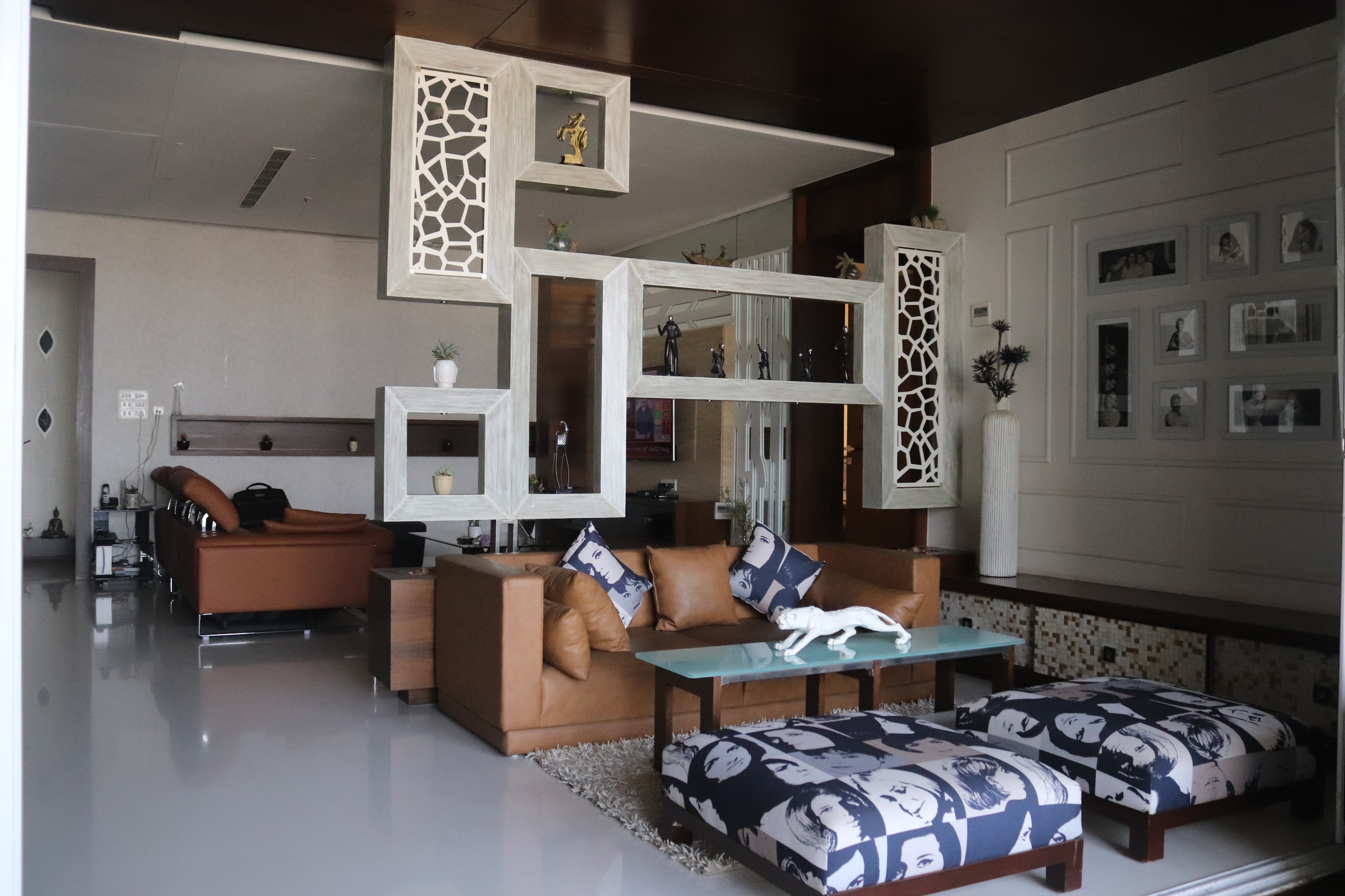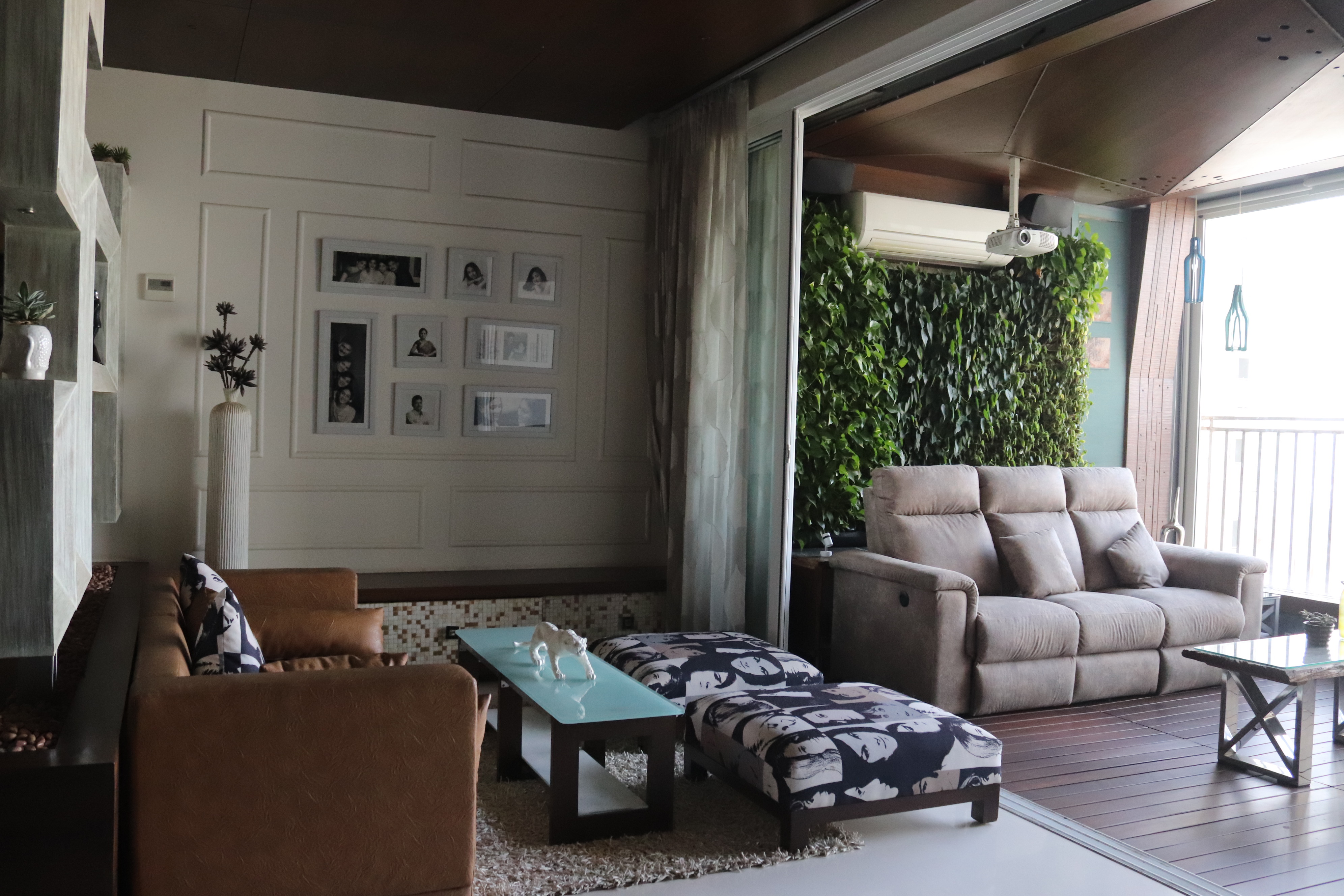 The overall design is contemporary with a feature wall act in the foyer that adds interest and energy through texture and colour acting as a decorative focal point with use of pop with stucco finish. the two living places are parersonlised wall of family photos. beside this, there is seating space, having a backdrop of living nature into the urban environment that is a green wall . complemented with a vaulted pyramid wooden false ceiling. the bedroom are designed with different look and ambience with custom-made furniture.