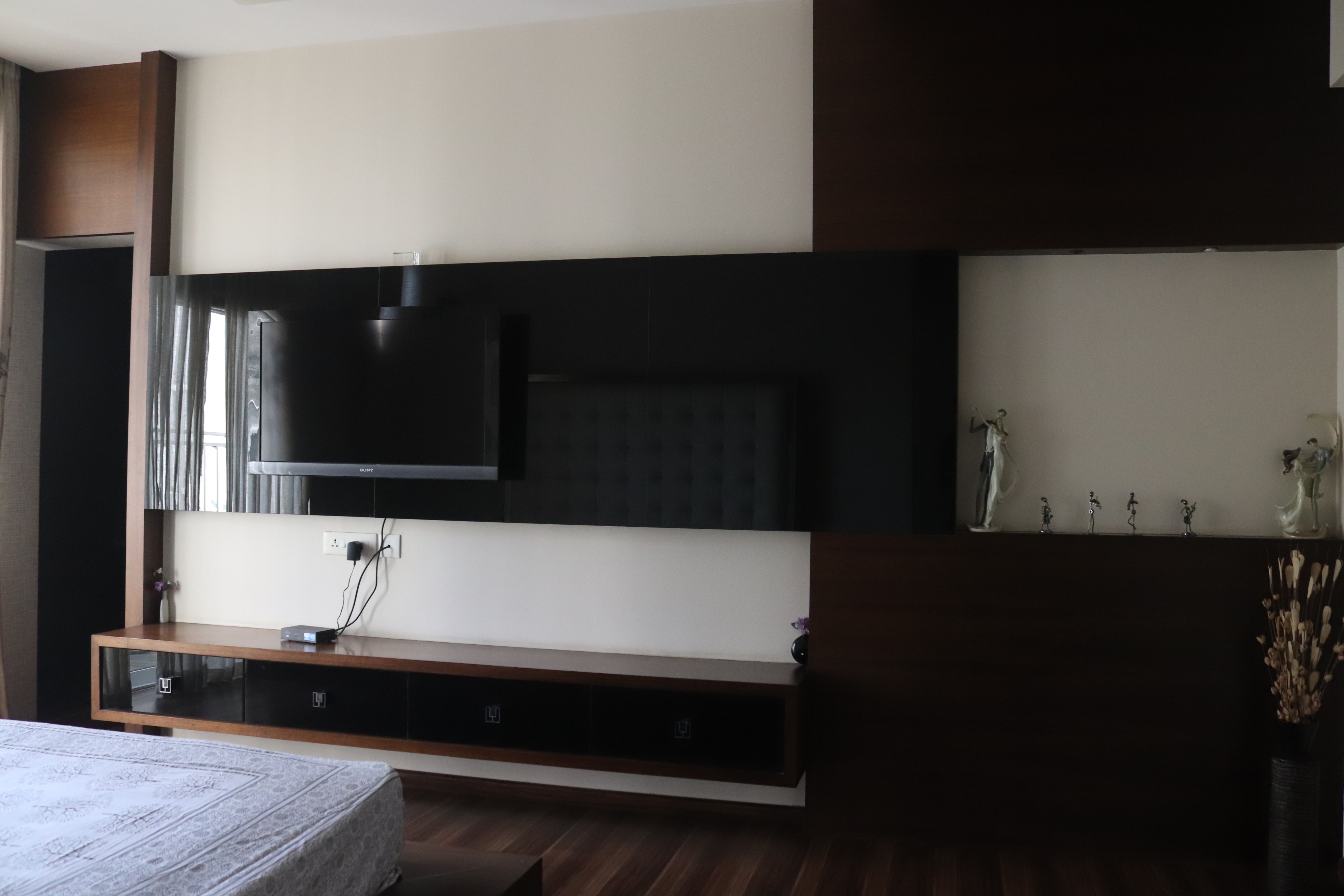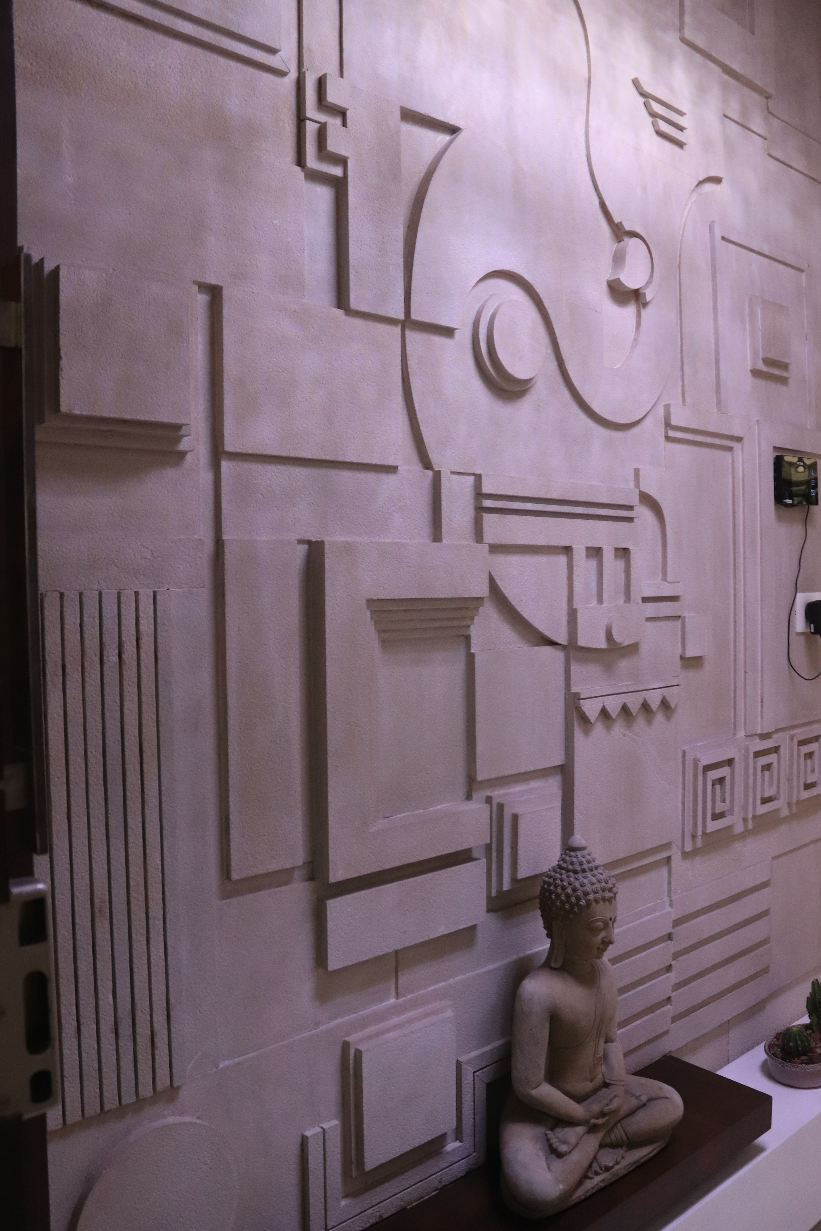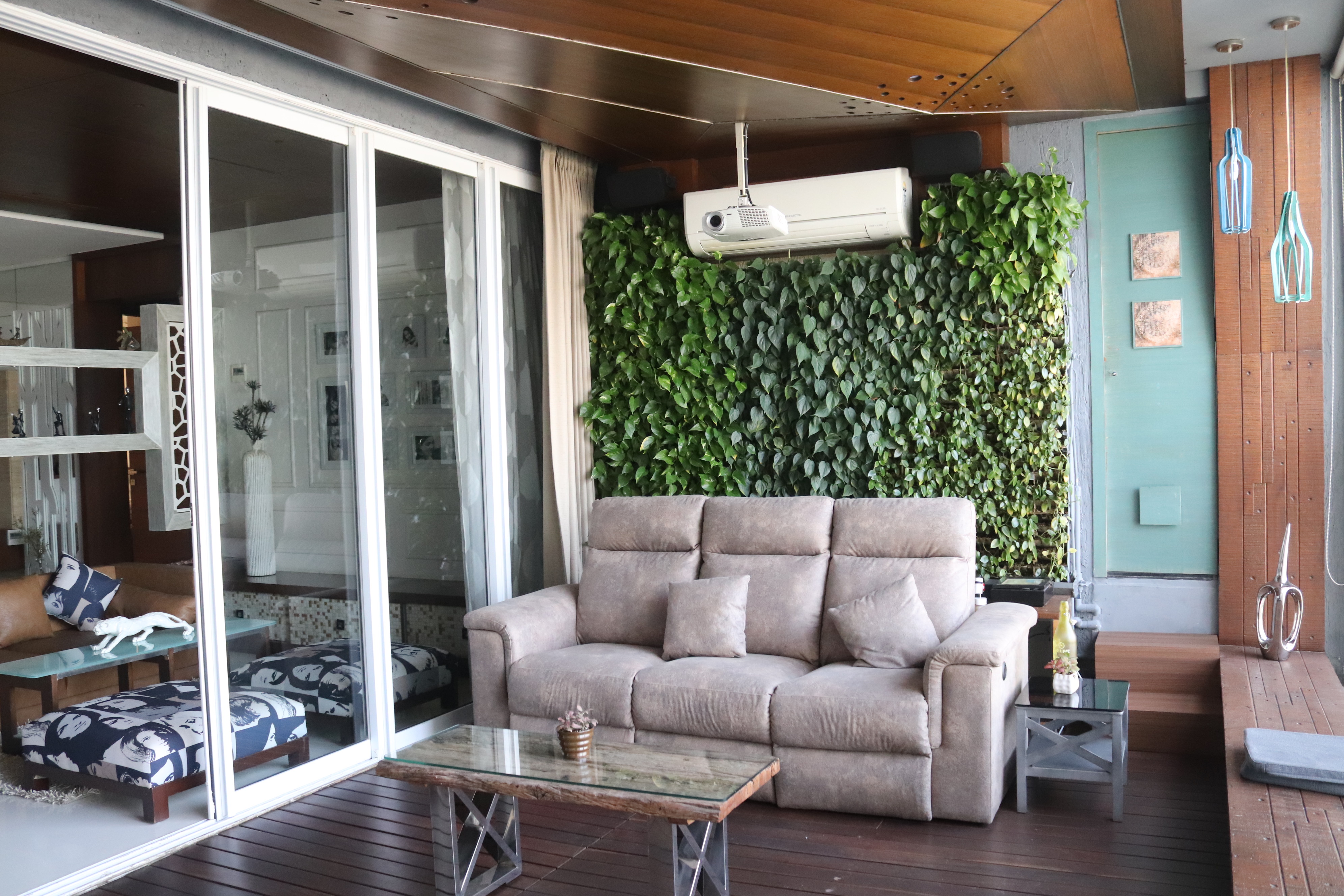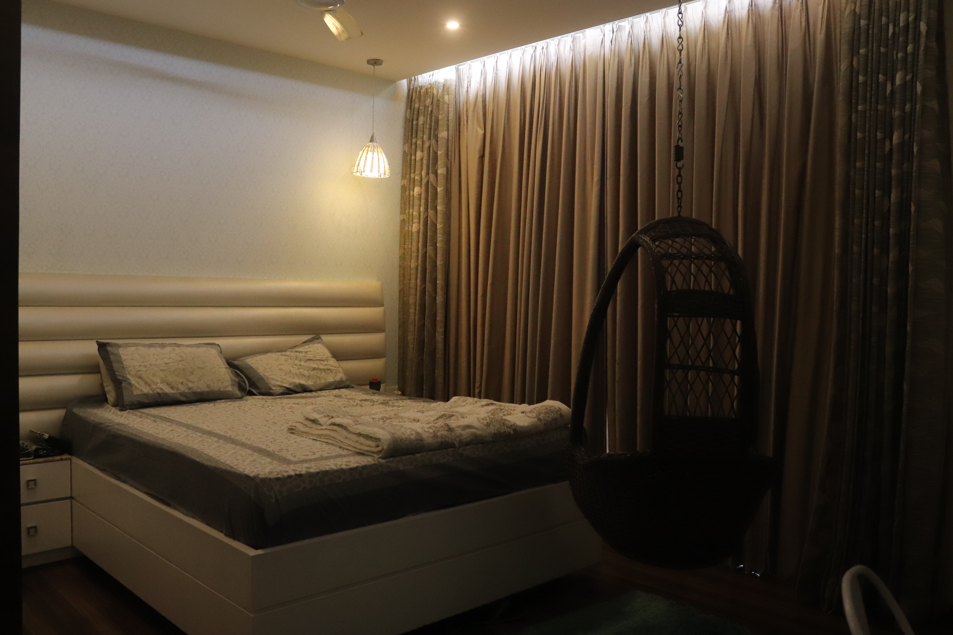 The overall design is contemporary with a feature wall act in the foyer that adds interest and energy through texture and colour acting as a decorative focal point with use of pop with stucco finish. the two living places are parersonlised wall of family photos. beside this, there is seating space, having a backdrop of living nature into the urban environment that is a green wall . complemented with a vaulted pyramid wooden false ceiling. the bedroom are designed with different look and ambience with custom-made furniture.