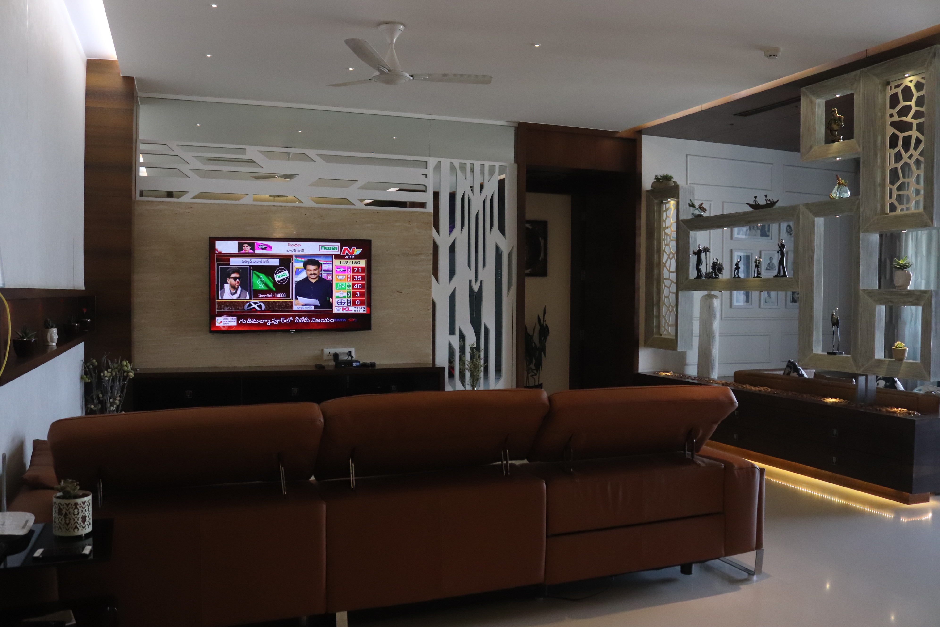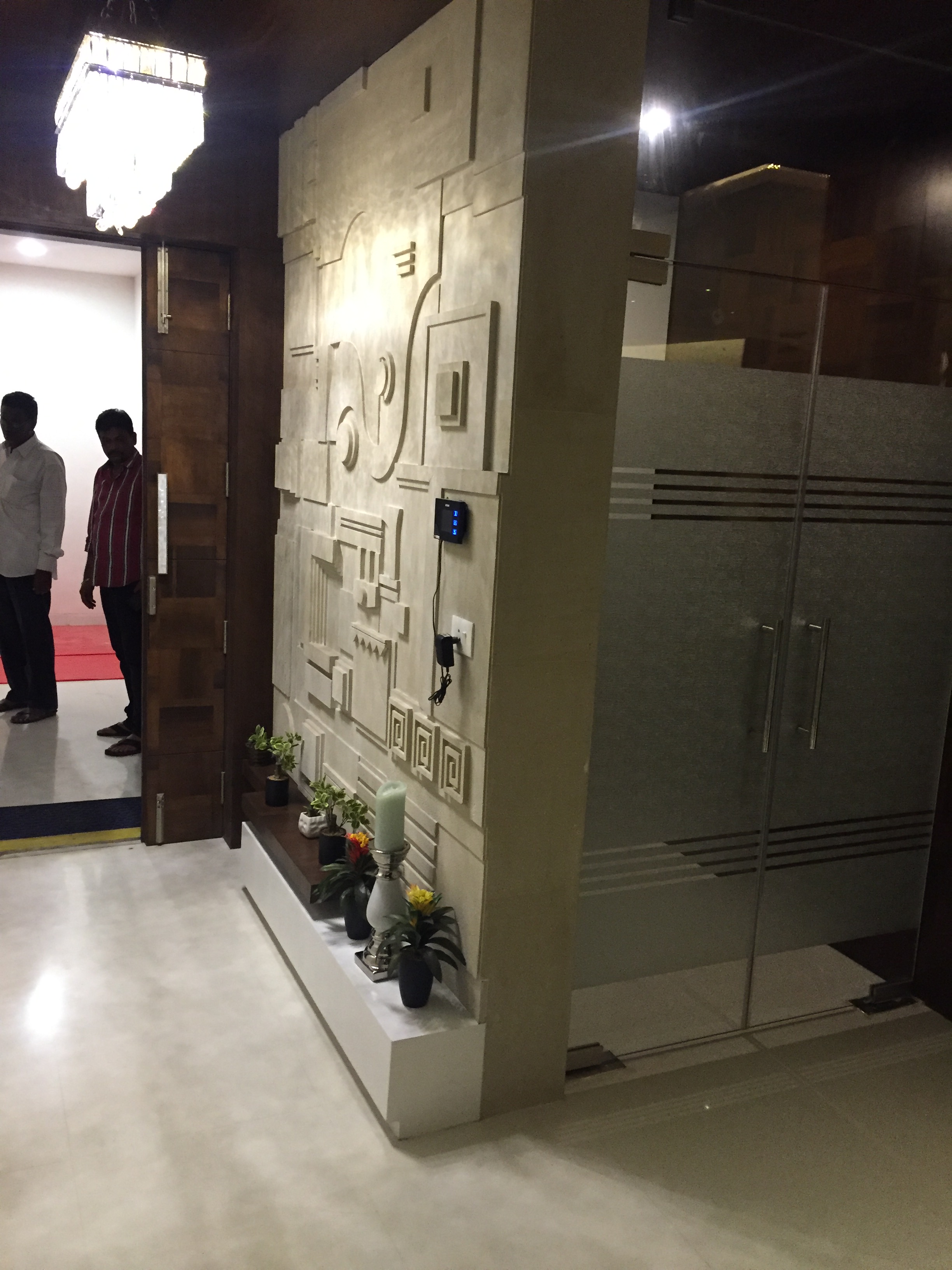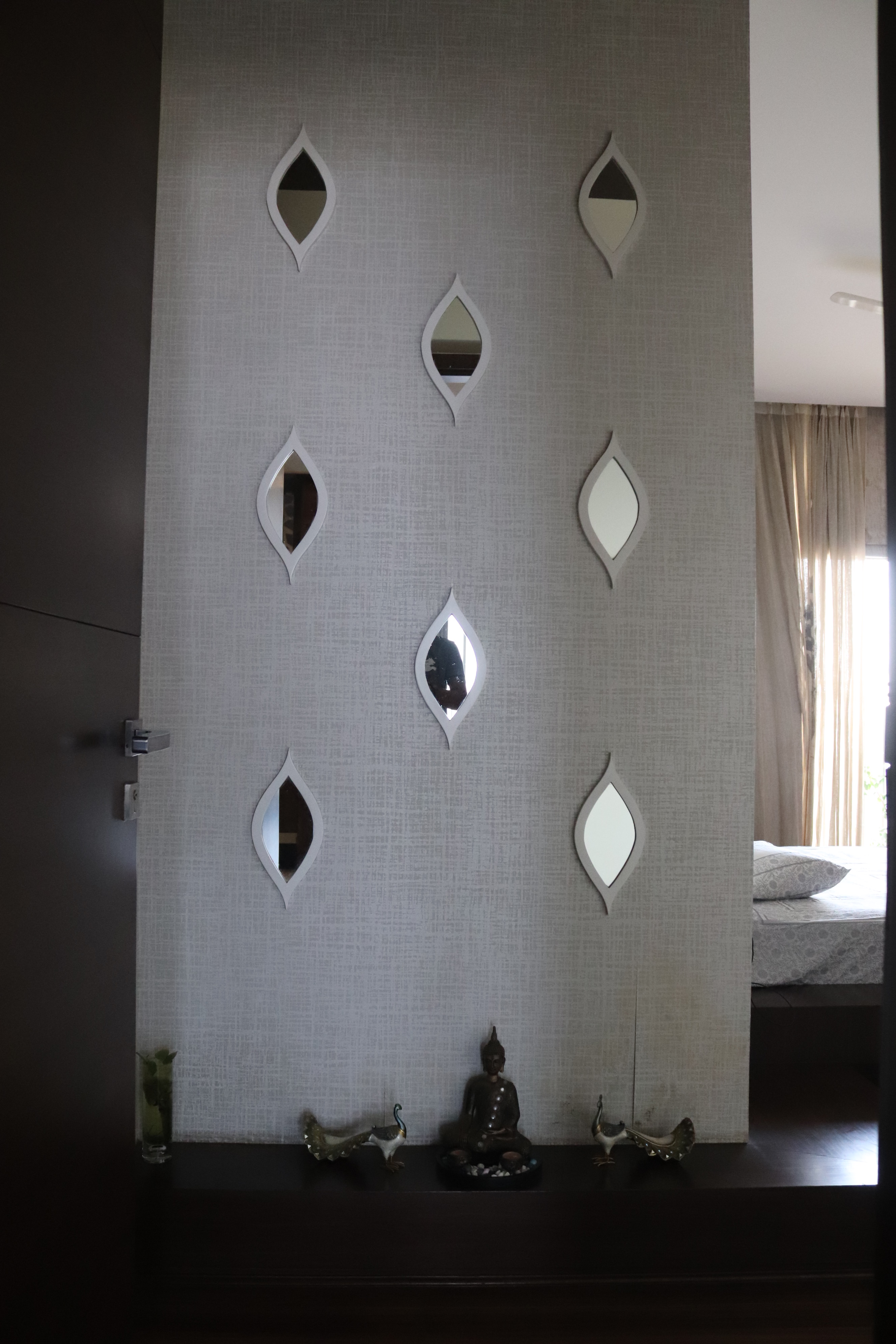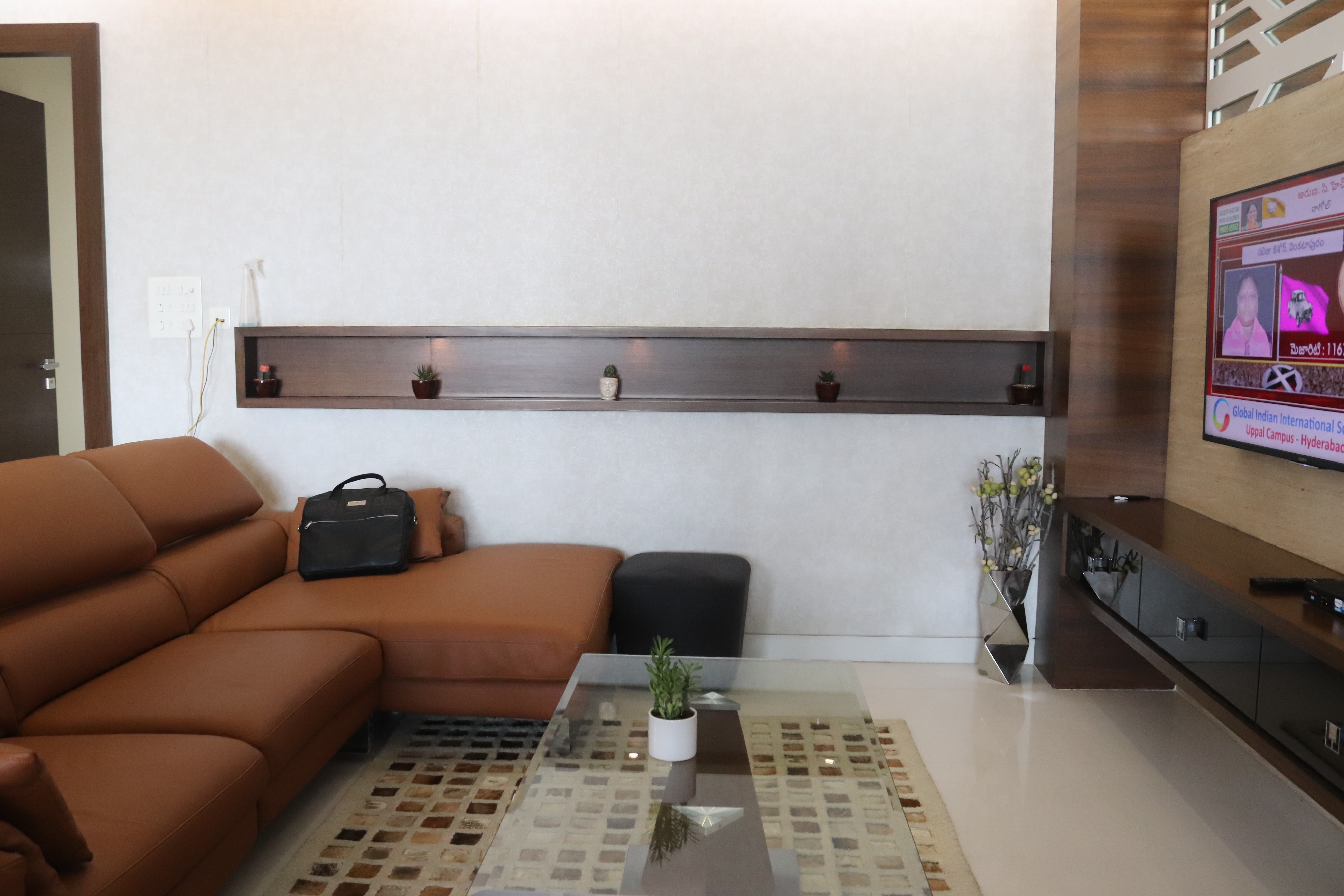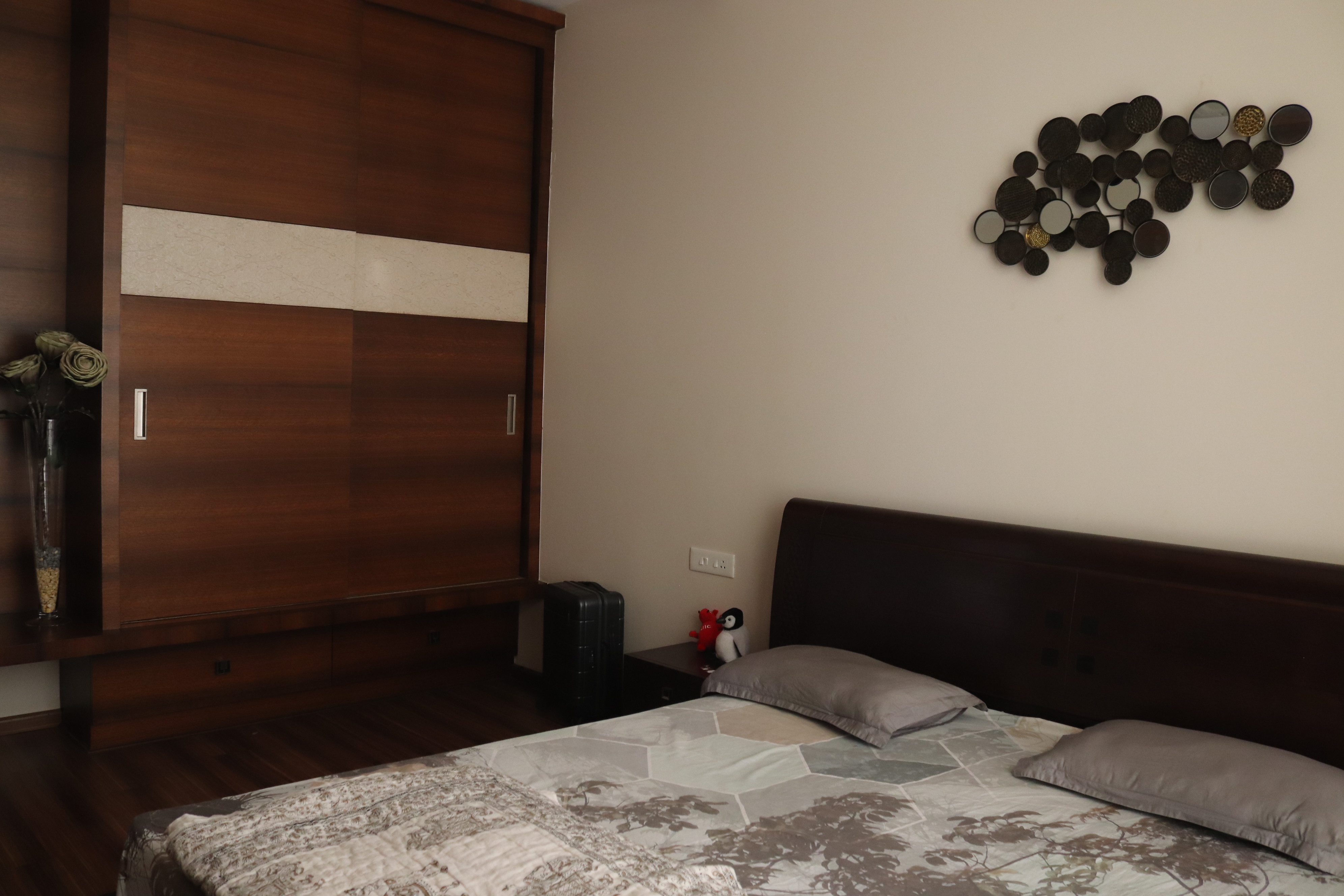 The overall design is contemporary with a feature wall act in the foyer that adds interest and energy through texture and colour acting as a decorative focal point with use of pop with stucco finish. the two living places are parersonlised wall of family photos. beside this, there is seating space, having a backdrop of living nature into the urban environment that is a green wall . complemented with a vaulted pyramid wooden false ceiling. the bedroom are designed with different look and ambience with custom-made furniture.