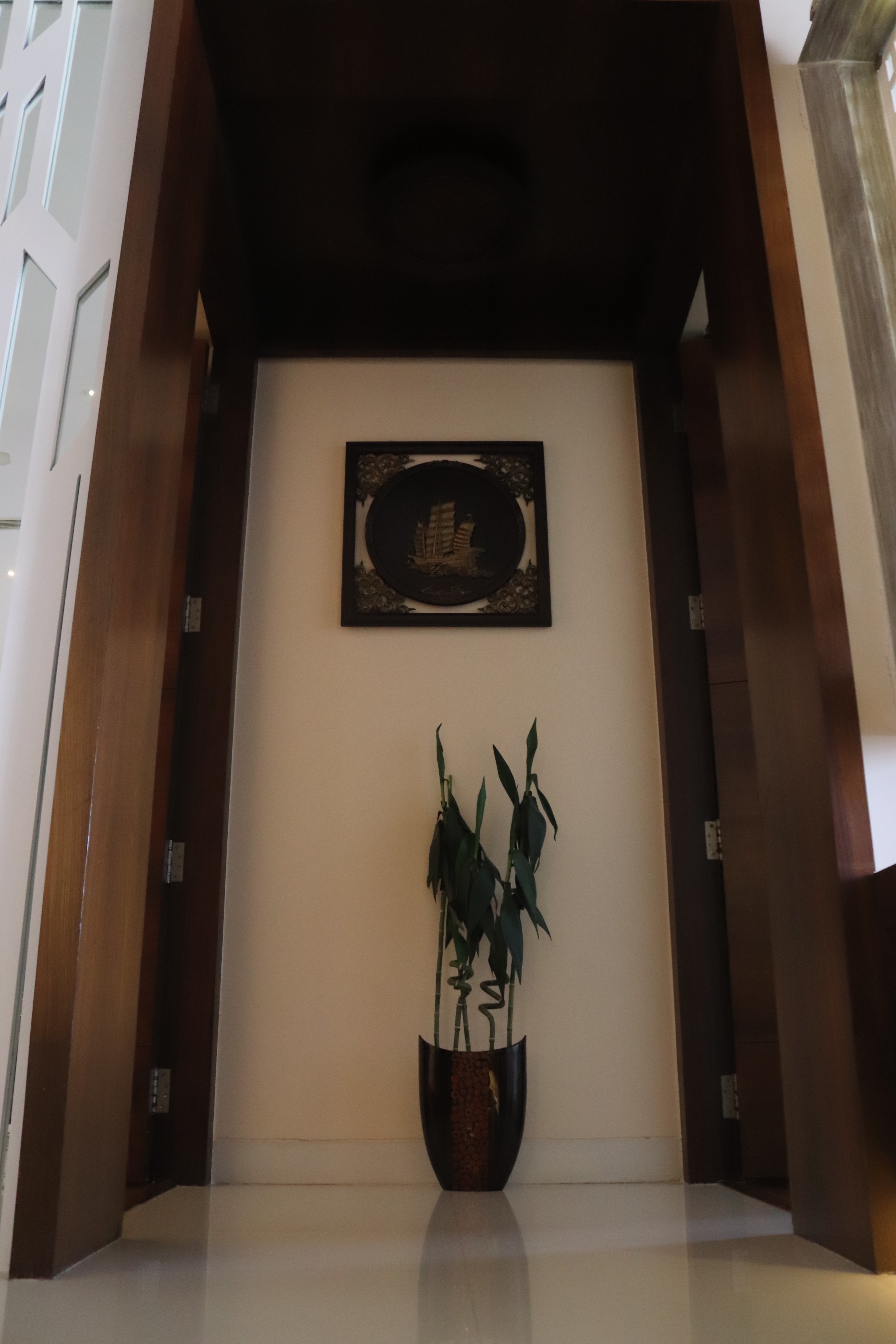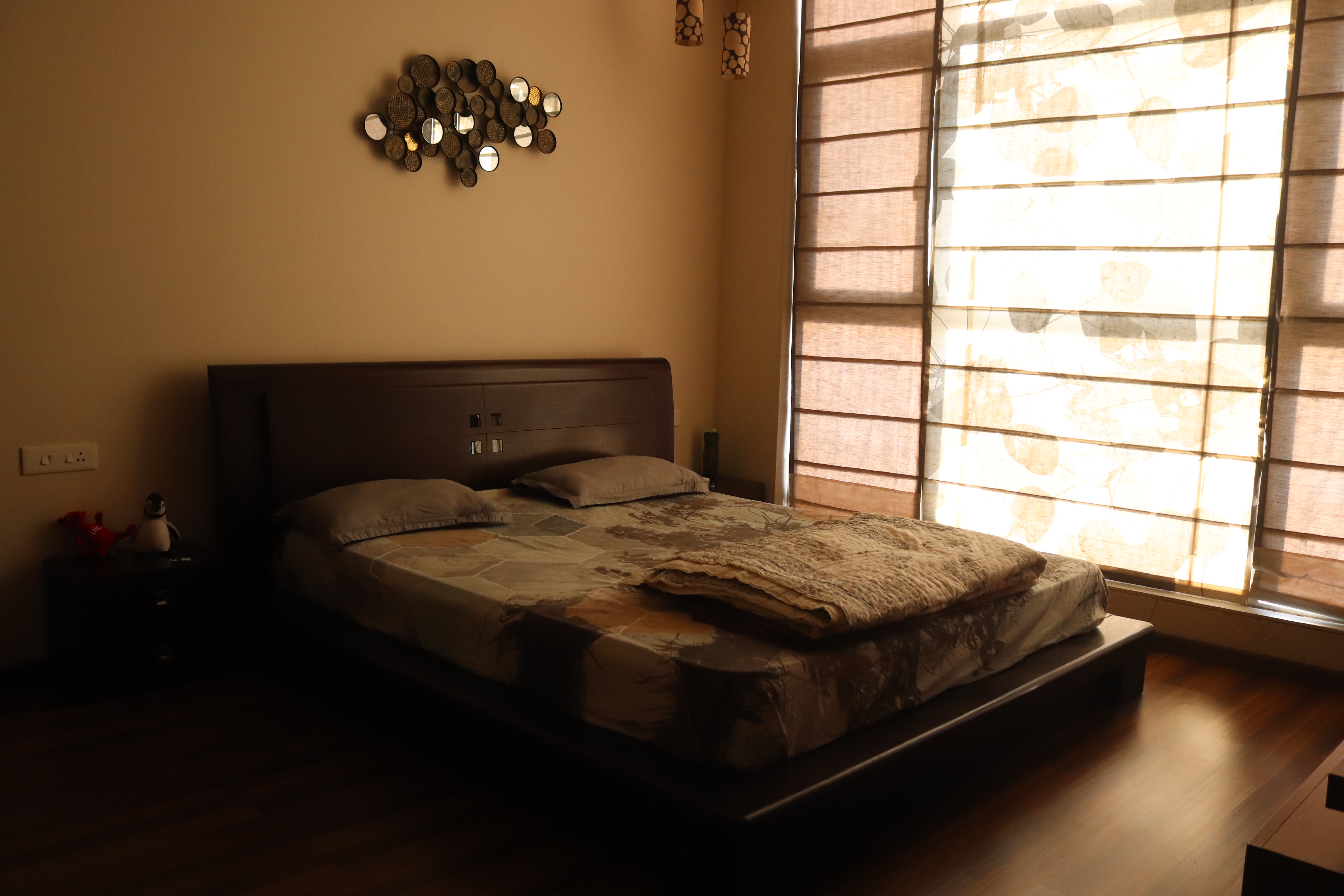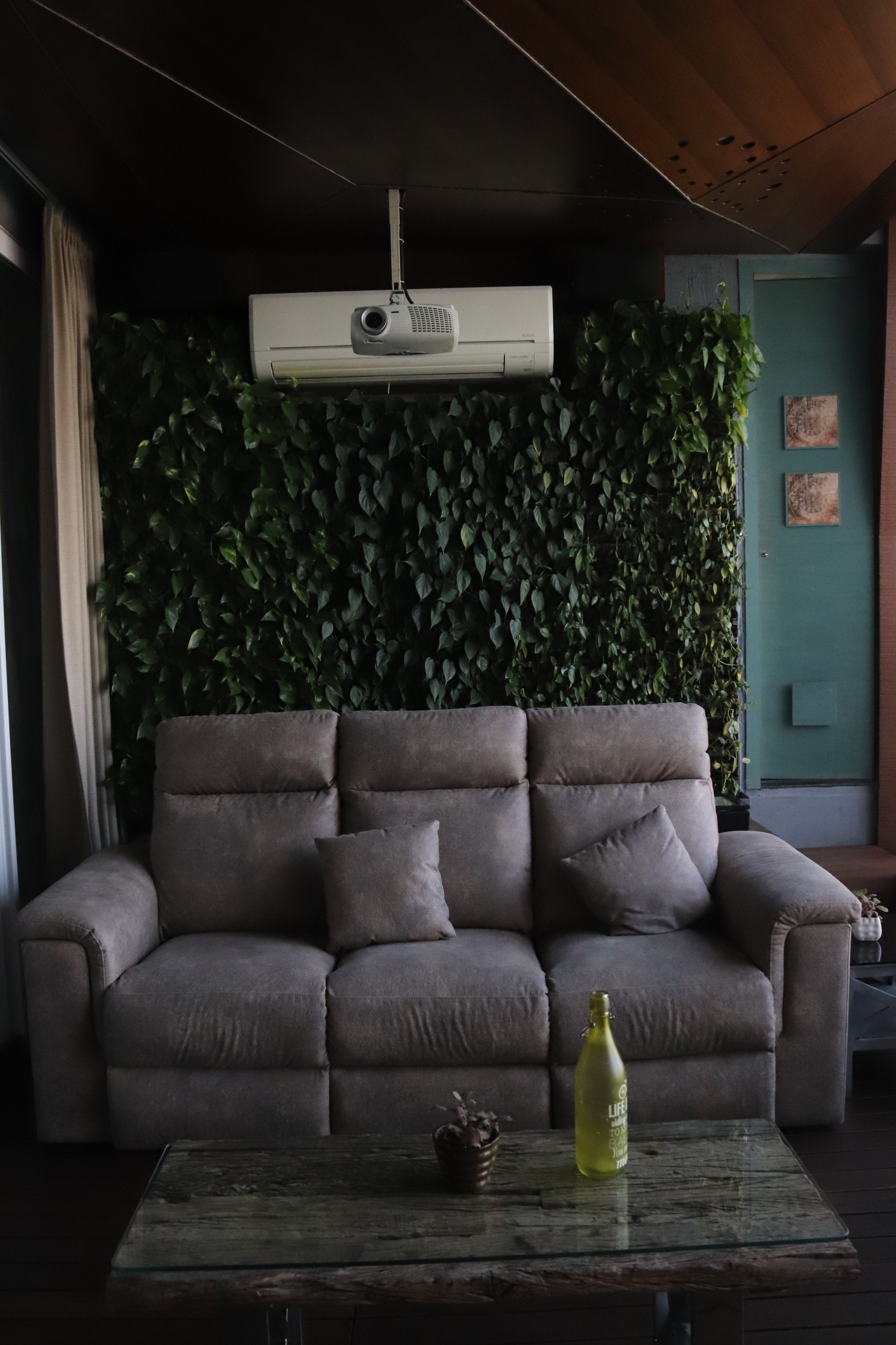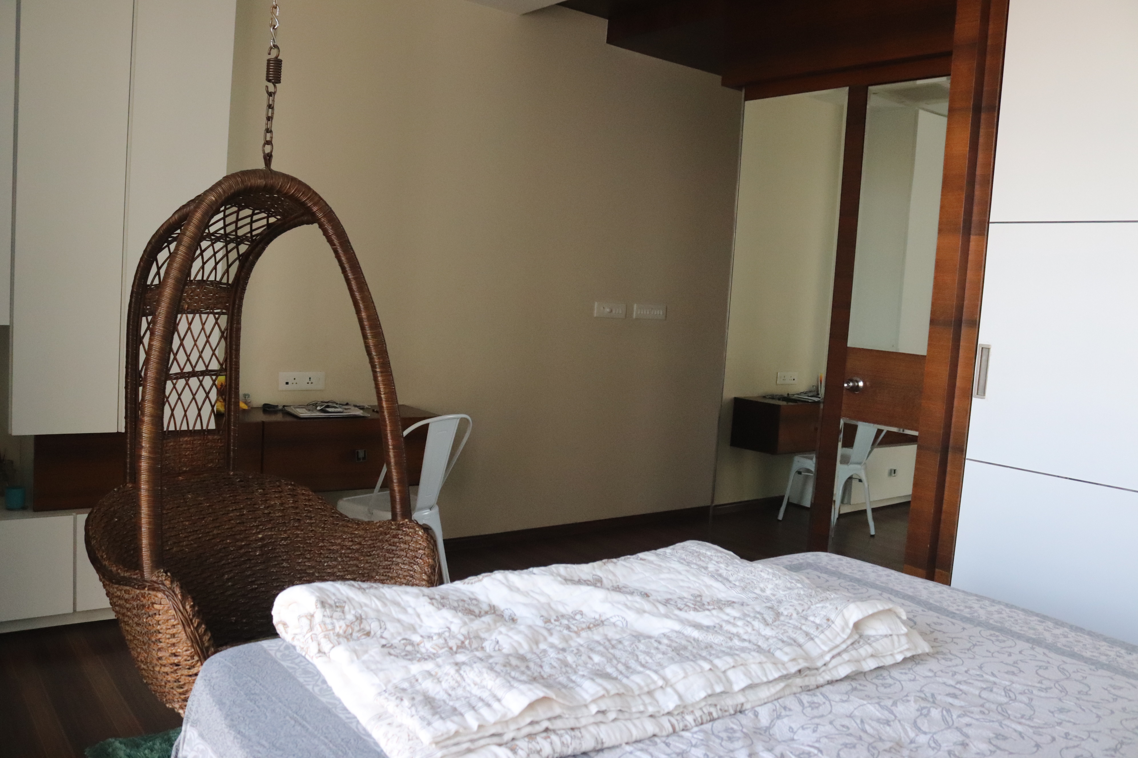 The overall design is contemporary with a feature wall act in the foyer that adds interest and energy through texture and colour acting as a decorative focal point with use of pop with stucco finish. the two living places are parersonlised wall of family photos. beside this, there is seating space, having a backdrop of living nature into the urban environment that is a green wall . complemented with a vaulted pyramid wooden false ceiling. the bedroom are designed with different look and ambience with custom-made furniture.